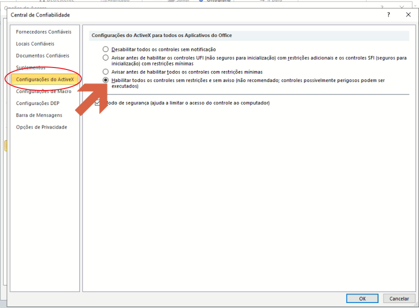 Access 2010: Devido as Configuracoes de Seguranca e a politica de seguranca atual este controle esta desabilitado. Para modificar a politica e habilitar o banco de dados use a Barra de Mensagem