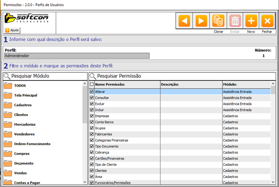 - Ao acessar um perfil, será possível verificar as permissões disponíveis para ele.