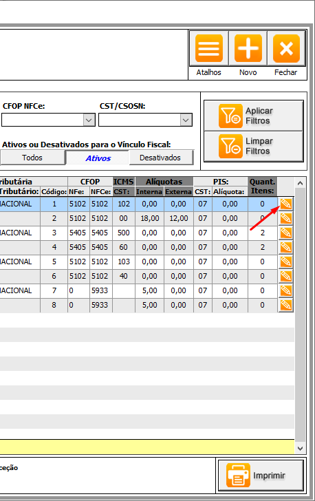 1.0 Acessar a tela de cadastro de Vinculo Fiscal >> Selecionar um vinculo e clicar em Editar.
