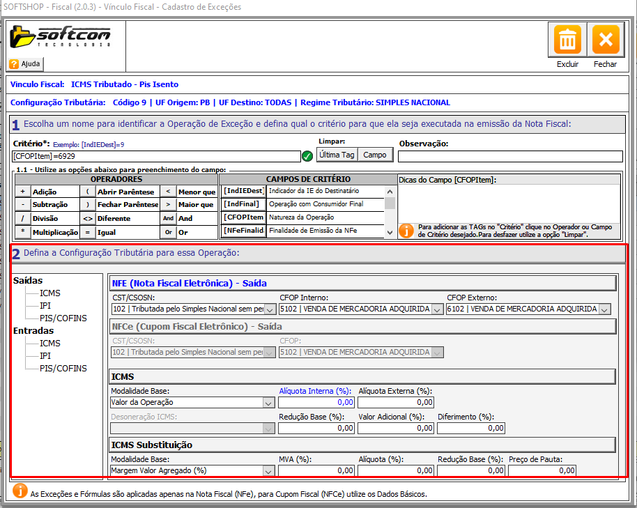 Nesse exemplo funcionará da seguinte forma; Se o CFOP do Item for o 6929 então ele vai atribuir as informações fiscais selecionada a baixo.