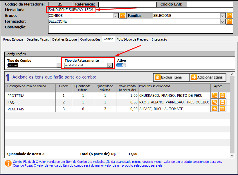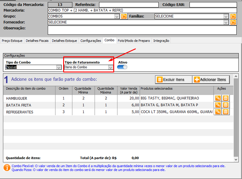 o faturamento "Itens do Combo" refere-se à venda de produtos que podem ser combinados para formar um combo, que inclui um conjunto de itens que podem ser vendidos a um preço promocional. Por exemplo, em uma lanchonete, um combo pode incluir um sanduíche, uma porção de batatas fritas e uma bebida, e o cliente pode escolher os itens que deseja incluir no combo. Nesse caso, o faturamento é feito individualmente para cada item.