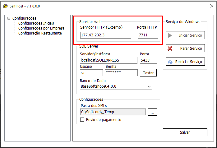 - Configure o SelfHost normalmente, com as informações do banco de dados do cliente. E configure a tag Servidor Web;