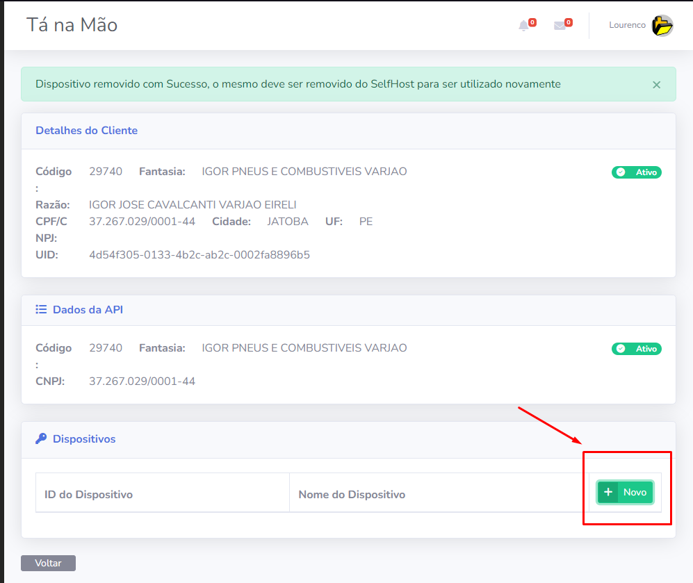 2.1.0. Após adicionar o produto Ta Na Mão no cliente, Adicione o dispositivo. Colando o endereço que você copiou no SelfHost.