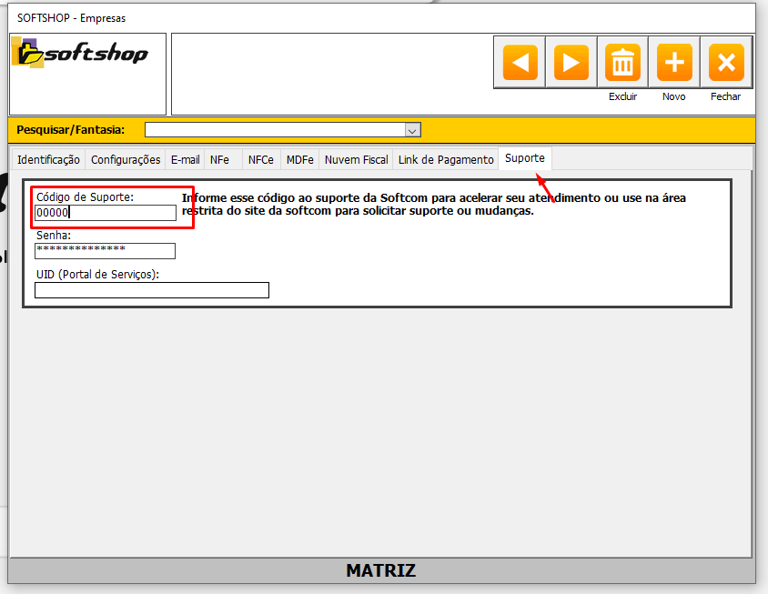 3.0.0. ATENÇÃO : Acessar o Softshop > Cadastro > Empresas > Suporte. E Preencher o campo Código de Suporte com o Registro do cliente, pode ser encontrado na agenda, o mesmo registro de login da Área do Cliente