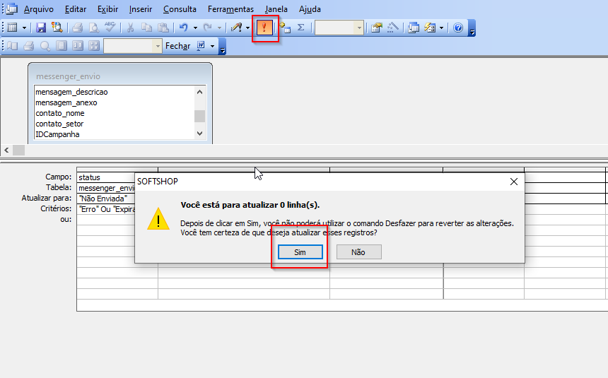 8 - Será exibida a consulta em Modo Design, para adequar a consulta de acordo com as mensagens do cliente, altere as seguintes informações