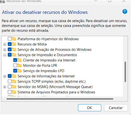 Com a tela de recursos abertas, procure a opção serviço de impressão LPD e marque a flag, ativando-a.