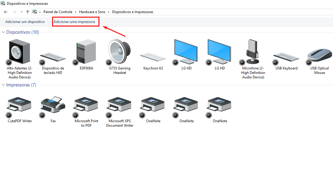 Passo 2: Na maquina na qual a impressora irá ser compartilhada, navegue até o Painel de Controle>Dispositivos e Impressoras>Adicionar Impressora.