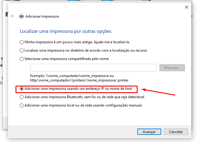 Passo 4: Após isso é só clicar na opção " Adicionar impressora usando endereço TCP/IP ou nome Host " e Avançar.