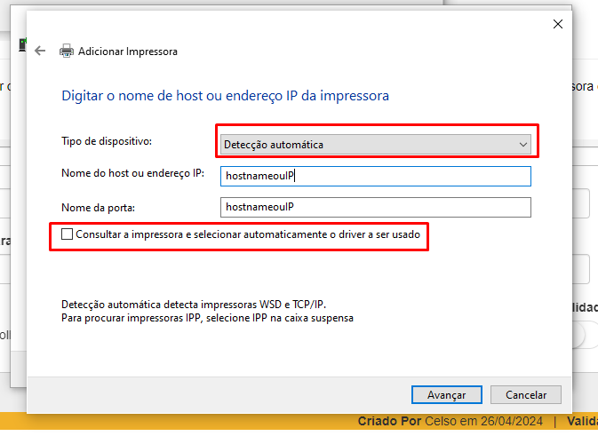 Passo 5: Preencher o campo nome do host ou endereço de IP, com o Hostname ou endereço IP da maquina que a impressora está. Em tipo de dispositivo, selecionar a opção " Detecção automática " e desmarcar a flag " Consultar a impressora e selecionar automaticamente o driver a ser usado ".
