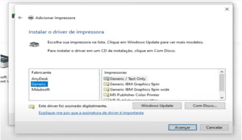 Passo 6: Selecionar o driver da impressora que será instalada, caso não encontre o driver na lista, deverá fazer o download e instalar na maquina em que a impressora irá ser compartilhada, após isso refazer o processo, selecionar o driver da impressora e avançar.