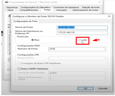 Passo 8: Com a impressora já instalada, vá até o painel de controle>Dispositivos e Impressoras... procure a impressora que acabou de instalar, clicar com botão direito do mouse, propriedades da impressora> portas> configuração de portas e marcar a opção LPR.