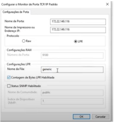 Passo 9:Preencher o nome do compartilhamento, que nesse caso vai ser o nome da impressora que está na rede no exemplo, essa está como "Generic" e marcar a opção "contagem de bytes LPR habilitada" e dar OK.